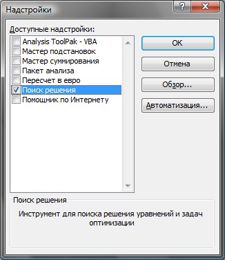 ставите галочку напротив «Поиска решения» и жмёте «ОК». После этого пункт «Поиск решения» появляется в меню «Данные».