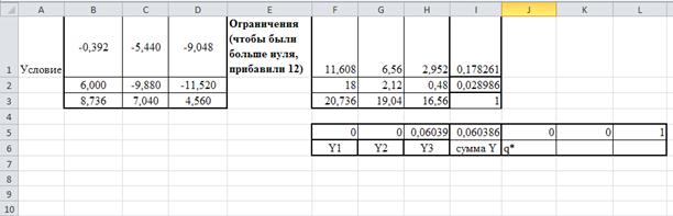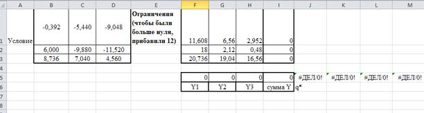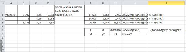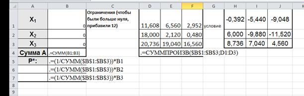 Теперь нам нужно записать формулы ограничений. Ставим курсор в ячейку под первым столбиком ограничений и пишем туда =СУММПРОИЗВ($B$1:$B$3;D1:D3), меняя, если нужно, адреса ячеек с иксами и адреса с первым столбиком ограничений. Такая формула просуммирует все произведения иксов на нужные числа из матрицы. Теперь копируем эту формулу вправо на все столбцы.