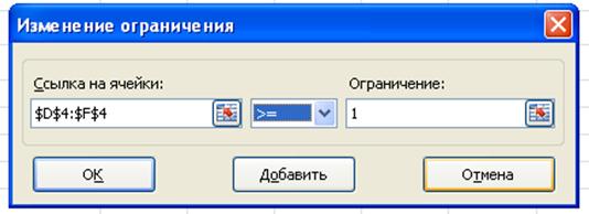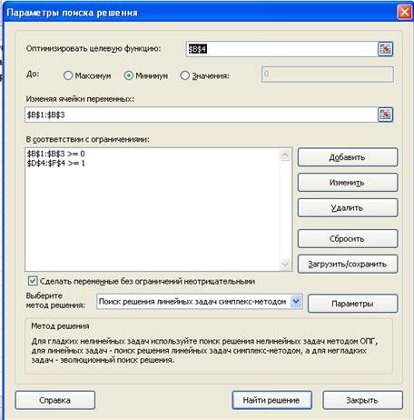 Целевой ячейкой устанавливаете ячейку с суммой иксов (у меня это $B$4). Переключатель ниже устанавливаете на «равной минимальному значению». Потом нажмёте кнопку «Предположить», и если вы вписали в иксы нули, то в окне автоматически появится диапазон ячеек иксов. Дальше вводим ограничения, всего их два: все иксы >= 0 и все ограничения >=1. Можно не выделять каждую клетку отдельно, а добавить весь диапазон для ограничений сразу, вот так:
