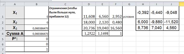 Когда в матрице есть элементы <= 0, то надо прибавить ко всей матрице одно такое число, чтобы все элементы стали > 0. Для наглядности покажем решение примера. Делаем в Excel табличку, куда записываем наши ограничения, и оставляем ячейки для иксов, суммы иксов и оптимальной стратегии для первого игрока p*. Иксов нам нужно столько, сколько у нас в матрице строк.