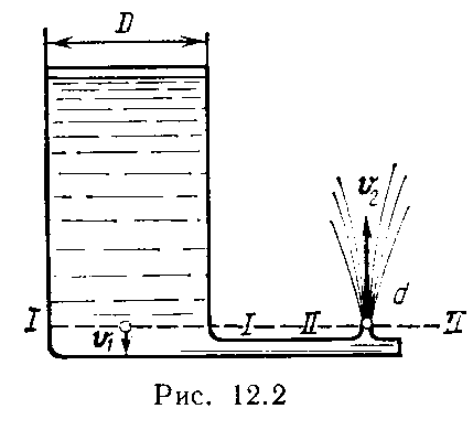 Пример 1. Вода подается в фонтан из большого цилиндрического бака (рис. 19) и бьет из отверстия II—II со скоростью υ2 = 12 м/с. Диаметр D бака равен 2 м, диаметр d сечения II—II равен 2 см. Найти: 1) скорость v1 понижения воды в баке; 2) давление p1, под которым вода подается в фонтан; 3) высоту h1 уровня воды в баке и высоту h2 струи, выходящей из фонтана.