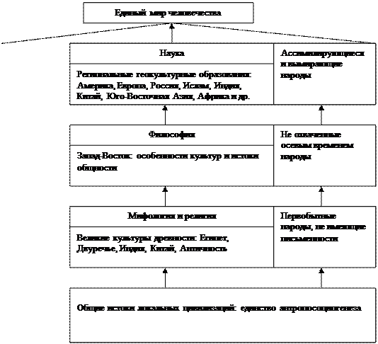 Философия возникает и становится в VIII – VI вв. до н.э. как результат развития духовности великих культур древнего мира (Египет, Двуречье, Индия, Китай, Античность). Существование собственно философского типа духовности в культуре древнего мира можно отнести к VI в. до н.э. "Осевым" называет время (V в. до н.э.) К.Ясперс время господства философской ментальности (духовности) как период поворота в движении локальных культур к единой культуре человечества[17] (рис.1). Удивительным, не получившим пока убедительного объяснения представляется сам факт одновременного возникновения философии во всех древних цивилизациях, разделенных географически, слабо связанных хозяйственно и уникальных по культуре[18]. На наш взгляд, несомненным остается вывод, что в становлении, функционировании и развитии духовной культуры всех существовавших тогда цивилизаций имеются общие истоки, общая, подчиняющаяся единым законам доистория и общее начало истории.