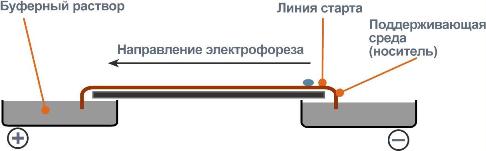 Ацетатцеллюлозная пленка, гель, специальная бумага (носитель) помещается на рамку, при этом противоположные края носителя свисают в кюветы с буферным раствором. На линию старта наносится сыворотка крови. Метод заключается в движении буферного раствора по поверхности носителя под влиянием электрического поля. Двигаясь, буферный раствор захватывает молекулы белков сыворотки. Молекулы с наибольшим отрицательным зарядом и наименьшим размером, т.е. альбумины, двигаются быстрее остальных. Наиболее крупные и нейтральные (γ-глобулины) оказываются последними.