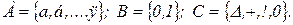 Алфавитом будем называть любое конечное множество попарно различных знаков, называемых буквами (символами) этого алфавита. Алфавит будем обозначать заглавными буквами, например: