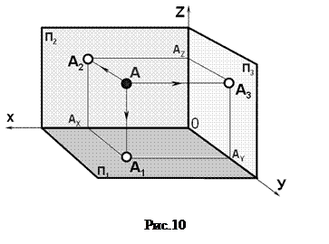 Точка А принадлежит первой четверти. Из данной точки проводят три проецирующих луча к плоскостям проекций П1, П2, П3. В результате получают три проекции точки (рис.10).