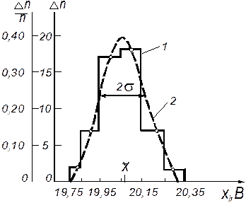 Рис.3. Гистограмма экспериментальных значений (1) и закона распределения