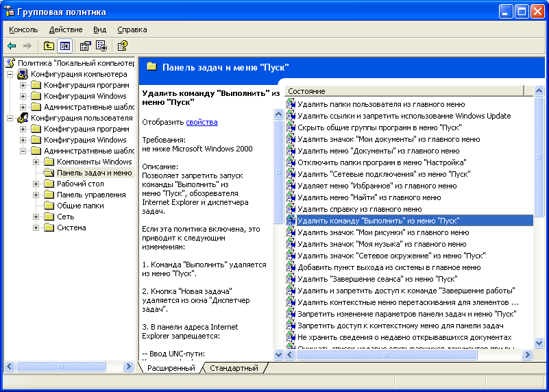 o Ограничение их прав на использование функций отдельных компонент системы (оснастка Редактор объектов групповой политики, gpedit.msc).