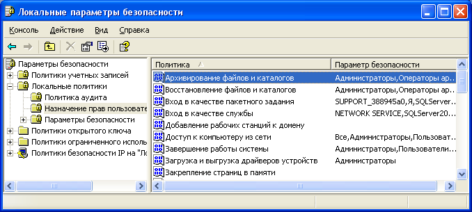 o Назначение им прав на использование возможностей системы в целом, напрямую связанных с безопасностью (оснастка Локальная политика безопасности, secpol.msc).