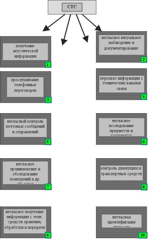 Физическая форма проявления информации и пространство информационных угроз с его типовыми составляющими (помещения, каналы связи, служащие) определяют сложившуюся к настоящему времени тактическую классификацию специальных технических средств (СТС).