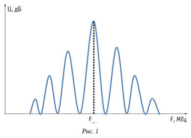 Как известно, большинство информационных ПЭМИН представляют собой последовательность прямоугольных импульсов (пачек прямоугольных импульсов). Спектр такого сигнала описывается функцией (sin x) / x и имеет следующий вид (см. рисунок).