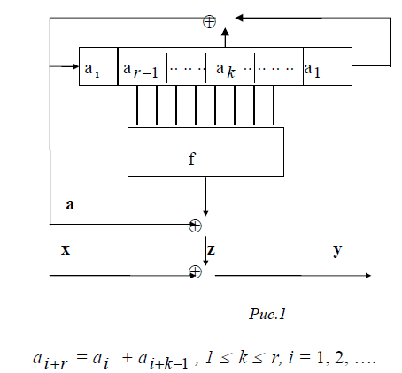 Пример 1. Рассмотрим генератор поточного шифра, в котором имеется известная двучленная линейная рекуррентная последовательность, усложненная некоторой булевой функцией f (неравновероятной), как это представлено на рис. 1.