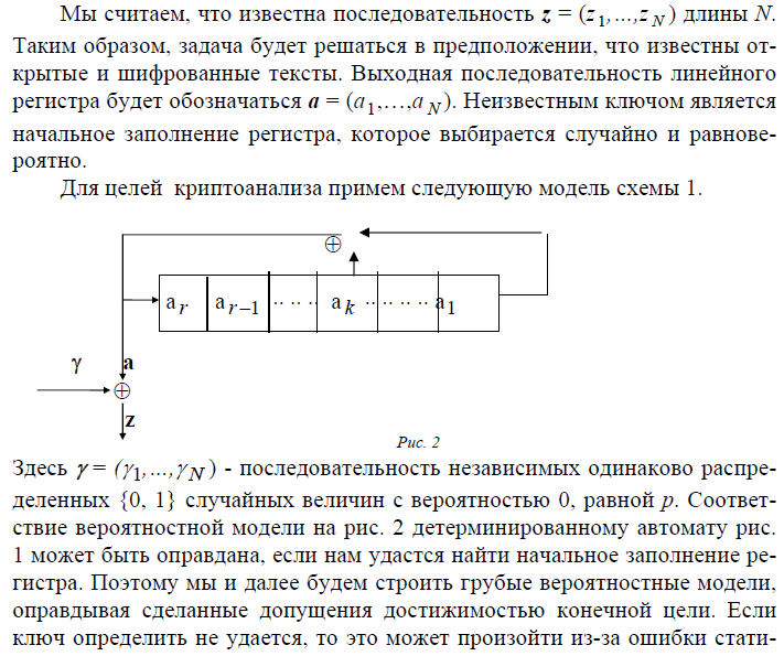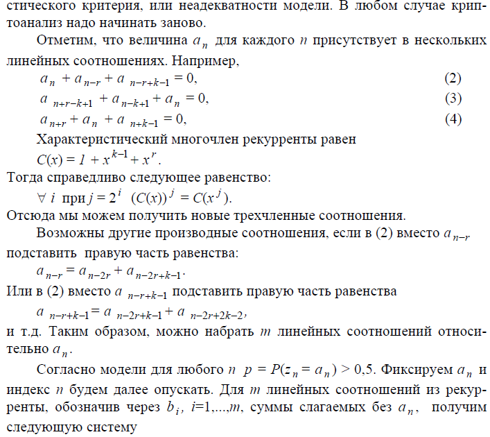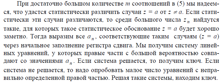 Чаще всего цель статистических методов криптоанализа состоит в том, чтобы построить критерий Н, необходимый для применения метода “разделяй и побеждай”. Оказывается, что большинство поточных шифров дают возможность применять против них корреляционные методы атак. Идея метода состоит в том, чтобы заменить исходное преобразование в шифре другим, зависящим от части ключа, что открывает возможность применения метода “разделяй и побеждай” или аналитических методов. В последнем случае часто стремятся свести задачу криптоанализа к решению системы линейных уравнений. Замена одного преобразования другим осуществляется так, чтобы сохранялась корреляционная связь с известной по-следовательностью знаков шифра, полученной при настоящем преобразовании. Тогда при опробовании части ключа эта статистическая связь дает критерий Н для определения правильного варианта опробоваемой части ключа. Если происходит сведение к линейной системе уравнений, то указанная статистическая связь позволяет построить линейную систему относительно элементов ключа.