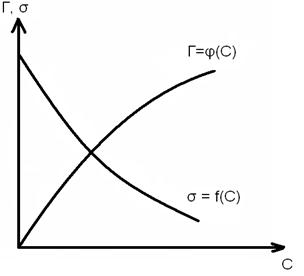 4. Пользуясь опытной кривой σ = f (с), с помощью уравнения Гиббса графически рассчитывают изотерму адсорбции Г= f (с) и тоже наносят на график.