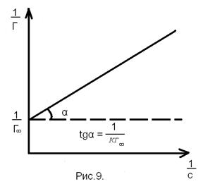 - предельная адсорбция, когда молекулы адсорбатаполностью покрывают поверхность жидкости, К – экспериментально определяемый параметр.