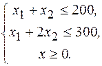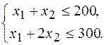 Изобразим все планы, на реализацию которых хватит времени: x 1+2 x 2£300. С этой целью построим отрезок прямой x 1+2 x 2=300. На этом отрезке лежат планы выпуска, полностью исчерпывающие запас времени, ниже – планы, на которые времени хватит с избытком, выше – не допустимые планы.