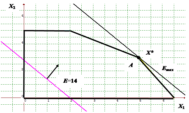 Таким образом, множество допустимых планов – есть затененная область X на рис. 1 (множество планов, на реализацию которых хватит и первого, и второго ресурса):