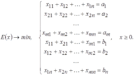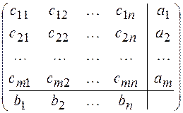 Имеется т пунктов хранения (баз) A 1, A 2,..., Am, на которых сосредоточены запасы некоторого товара в количествах соответственно a 1, a 2,..., am условных единиц. Кроме того, имеется п пунктов потребления (магазинов) B 1, B 2,..., Bn, подавших заявки соответственно на b 1, b 2,..., bn единиц товара. Стоимость перевозки единицы товара из пункта Ai (i = 1, 2, …, m) в пункт Bk (k = 1, 2, …, n) составляет cik денежных единиц). Предполагается, что общая стоимость перевозки партии товара пропорциональна количеству товара в этой партии.