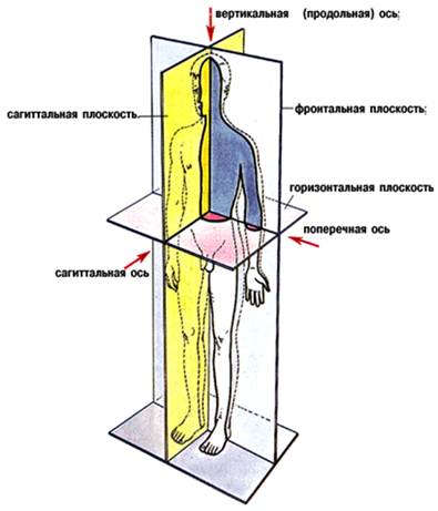 | Плоскости | 1) горизонтальная — лежит параллельно линии горизонта и разделяет тело на верхнюю и нижнюю части; 2) фронтальная — в вертикальном направлении параллельно плоскости лба, делит тело на передний и задний отделы; 3) сагиттальная (sagitta — стрела) — вертикальная, делит тело в переднезаднем направлении на правую и левую части; при прохождении через середину тела делит его на 2 симметричные половины (правую и левую) и называется срединной плоскостью. |