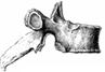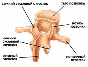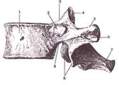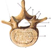 | 1 -тело позвонка; 2-реберная ямка; 3-верхняя позвоночная вырезка; 4-верхний суставной отросток; 5-поперечная реберная ямка (реберная ямка поперечного отростка); 6-поперечный отросток; 7-остистый отросток; 8-нижние суставные отростки; 9-нижняя позвоночная вырезка |
