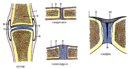 Рис. 1.3. Виды соединения костей, где 1 – надкостница, 2 – кость, 3 – волокнистая соединительная ткань, 4 – хрящ, 5 – синовиальная мембрана, 6 – фиброзная мембрана, 7 – суставной хрящ, 8 – суставная полость, 9 – щель, 10 – диск.