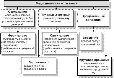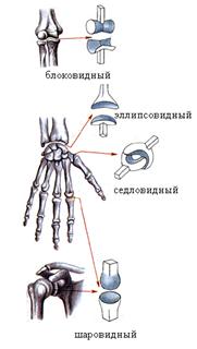 | 1. цилиндрический; 2. эллипсоидный; 3. шаровидный; 4. мыщелковый; 5. плоский; 6. седловидный; 7. блоковидный. | 1. простой – две суставных поверхности; 2. сложный (более двух суставных поверхностей). | 1. одноостный (цилиндрический, блоковидный); 2. двуосный (эллипсоидный, седловидный); 3. трехосный (шаровий, плоский) | |