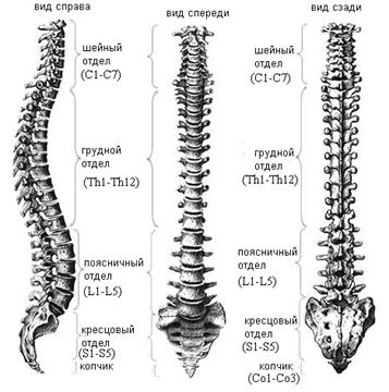 | Позвоночник | Шейный, грудной, поясничный, крестцовый, копчиковый отделы |