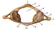 Вид сверху. I-задний бугорок; 2-задняя дуга; 3-позвоночное отверстие; 4-борозда позвоночной артерии; 5-верхняя суставная ямка; 6-попе-речное отверстие (отверстие поперечного отростка); 7-попереч-иый отросток; 8-латеральная масса; 9-ямка зуба; 10-передний бугорок; 11 -передняя дуга. | |