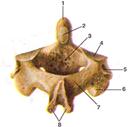 | Вид сзади и сверху. 1-зуб осевого позвонка; 2-задняя суставная поверхность; 3-тело позвонка; 4-верхняя суставная поверхность; 5-поперечный отросток; 6-нижний суставной отросток: 7-дуга позвонка; 8-остистьн отросток. |