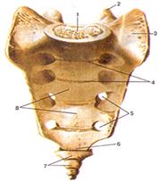 Кресцовый (S1 – S5) | К 17-20 годам срастаются и образуют крестцовую кость. Это приспособление к несению большой нагрузки, испытываемое крестцом в связи с вертикальным положением тела; форма треугольная – выделяют расширенное кверху основание и направленное книзу и кпереди верхушку кретца; латеральные части имеют ушковидные поверхности для сочленения с ушковидными поверхностями подвздошной костей. Вид спереди (тазовая поверхность). 1-основание крестца; 2-верхний суставной отросток; 3-латеральная часть; 4-поперечные линии; 5-тазовые крестцовые отверстия; 6-верхушка крестца; 7-копчик; 8-крестцовые позвонки |