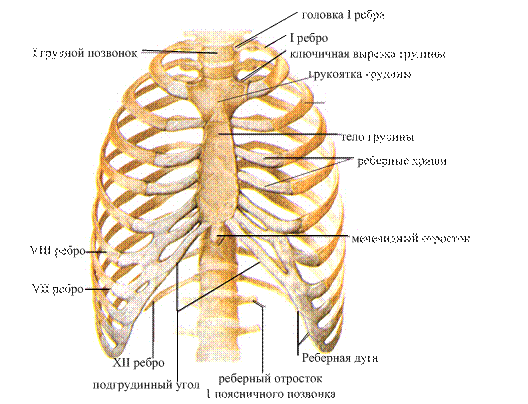 | Грудная клетка | 12 ребер (10 пар сросшихся, 2 пары несросшиеся), грудина, грудной отдел позвоночника |