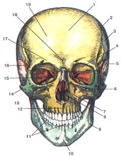 Рис. 1.9. Череп. Вид спереди. 1-лобная кость; 2-венечный шов; 3-теменная кость; 4-глазница; 5-чешуя височной кости; 6-скуловая кость; 7-верхняя челюсть; 8-фушевидное отверстие; 9-нижняя челюсть; 10-подбородочная бугристость; 11-зубы нижней челюсти; 12-межверхнечелюстной шов; 13-носовая кость; 14-скуловая дуга; 15-слезная кость; 16-большое крыло клиновидной кости; 17-надбровная дуга; 18-глабелла (надпереносье); 19-лобный бугор.
