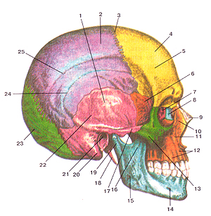 Рис. 1.10. Череп. Вид сбоку. 1-височная кость; 2-теменная кость; 3-венечный шов; 4-лобная кость; 5-лобный бугор; 6-большое крыло клиновидной кости; 7-глазница; 8-слезная кость; 9-носовая кость; 10-лобный отросток верхней челюсти; 11-верхняя челюсть; 12-альвеолярные возвышения верхней челюсти; 13-скуловая кость; 14-подбородочное отверстие; 15-бугристость нижней челюсти; 16-венечный отросток нижней челюсти; 17-скуловая дуга; 18-шиловидный отросток; 19-суставной отросток нижней челюсти; 20-сосцевидный отросток височной кости; 21-наружный слуховой проход; 22-чешуя височной кости; 23-затылочная кость; 24- нижняя височная линия; 25- верхняя височная линия.