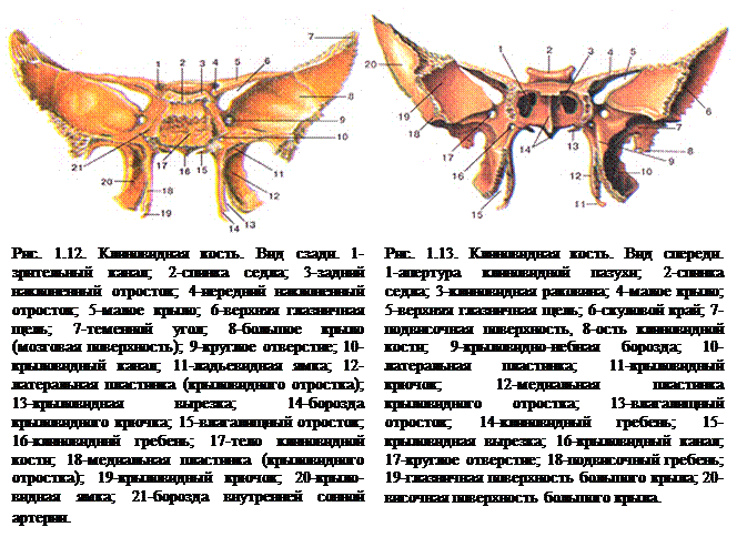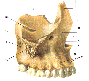 Рис. 1.19. Верхняя челюсть правая. Вид сбоку. 1-лобный отросток; 2-передний слезный гребень; 3-подглазнич-ный край; 4-передняя поверхность; 5-подглазничное отверстие; 6-носовая вырезка; 7-передняя носовая ость; 8-тело верхней челюсти; 9-альвеолярные возвышения; 10-скуловой отросток; 11-альвеолярные отверстия; 12-бугор верхней челюсти; 13-под-глазничная борозда; 14-глазничная поверхность.