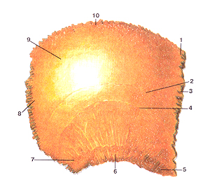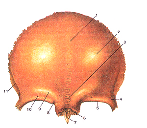 Рис. 1.14. Теменная кость. Наружная поверхность. 1-лобный угол; 2-верхняя височная линия; 3-лобный край; 4-ни-жняя височная линия; 5-клиновидный угол; 6-чешуйчатый край; 7-сосцевидный угол; 8-затылочный край; 9-теменной бугор; 10-сагиттальный край.