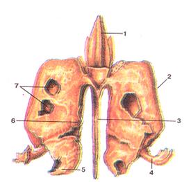 Рис. 1.15. Решетчатая кость. Вид сзади. 1-петушиный гребень; 2-глазничная пластинка; 3-перпендику-лярная пластинка; 4-крючковидный отросток; 5-средняя носовая раковина; 6-верхняя носовая раковина; 7-решетчатые ячейки.
