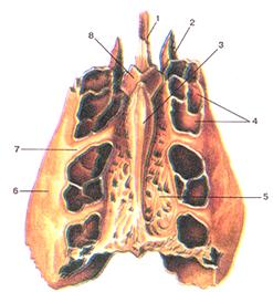 Рис. 1.16. Решетчатая кость. Вид сверху. 1-перпендикулярная пластинка; 2-средняя носовая раковина; 3-петушиный гребень; 4-решетчатые ячейки; 5-решетчатая пластинка; 6-глазничная пластинка; 7-передняя решетчатая борозда; 8-крючковидный отросток.