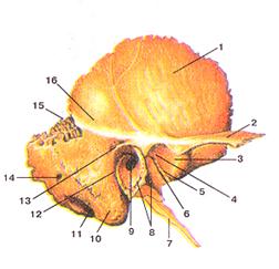 Рис. 1.17. Височная кость. Наружная поверхность. 1-чешуйчатая часть (чешуя) височной кости; 2-скуловой отросток; 3-суставной бугорок; 4-нижнечелюстная ямка 5-каменисто-чешуйчатая щель; 6-каменисто-барабанная щель; 7-шиловидный отросток; 8-барабанная часть височной кости; 9-наружное слуховое отверстие; 10-сосцевидный отросток; 11-сосцевидная вырезка; 12-барабанно-сосцевидная щель; 13-надпроходная ость (над слуховым проходом); 14-сосцевидное отверстие; 15-теменная вырезка; 16-височная линия.