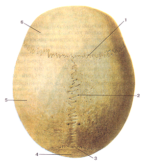 Рис. 1.18. Крыша черепа. Вид сверху. 1-венечный шов; 2-сагиттальный шов; 3-ламбдовидный шов; 4-затылочная кость (чешуя); 5-теменная кость; 6-лобная кость.