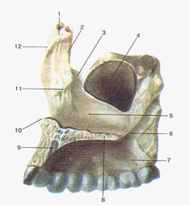 Рис. 1.20. Верхняя челюсть, правая. Вид с внутренней стороны. 1-лобный отросток; 2-слезный край; 3-слезная борозда; 4-верх-нечелюстная (Гайморова) пазуха; 5-носовая поверхность тела верхней челюсти; 6-большая небная борозда; 7-альвеолярный отросток; 8-небный отросток; 9-резцовый канал; 10-передная носовая ость; 11-раковинный гребень; 12-решетчатый гребень.