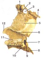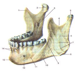 Рис. 1.26. Нижняя челюсть. 1-венечный отросток; 2-мыщелковый отросток; 3-отверстие нижней челюсти; 4-вырезка нижней челюсти; 5-головка нижней челюсти; 6-ветвь нижней челюсти; 7-жевательная бугристость; 8-угол нижней челюсти; 9-косая линия; 10-основание нижней челюсти; 11-тело нижней челюсти; 12-подбородочное отверстие; 13-подбородочный выступ; 14-альвеолярные возвышения.