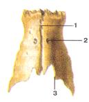 Рис. 1.24. Носовые кости. Вид сверху. 1-межносовой шов; 2-отверстие носовой кости; 3-свободный край.