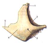 Рис. 1.25. Скуловая кость, правая. Вид сбоку. 1-лобный отросток; 2-глазничная поверхность; 3-скуло-глазничное отверстие; 4-латеральная поверхность; 5-височный отросток.