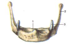 Рис. 1.27. Подъязычная кость. Вид спереди. 1-тело подъязычной кости; 2-большой рог; 3-малый рог
