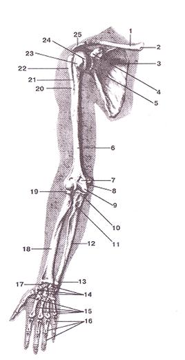 Рис. 1.29. Скелет (кости) верхней конечности. Вид спереди. 1-ключица; 2-грудинный конец ключицы; 3-лопатка; 4-клювовидный отросток лопатки; 5-суставная впадина лопатки; 6-плечевая кость; 7-венечная ямка плечевой кости; 8-медиальный надмыщелок; 9-блок плечевой кости; 10-венечный отросток; 11-бугристость локтевой кости; 12-локтевая кость; 13-головка локтевой кости; 14-кости запястья; 15-I-V пястные кости; 16-фаланги пальцев; 17-шиловидный отросток лучевой кости; 18-луче-вая кость; 19-головка лучевой кости; 20-гребень большого бугорка; 21-межбугорковая борозда; 22-большой бугорок; 23-малый бугорок; 24-головка плечевой кости; 25-акромион.
