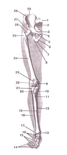 Рис. 1.30. Скелет (кости) нижней конечности. 1-крестец; 2-крестцово-подвздошный сустав; 3-верхняя ветвь лобковой кости; 4-симфизиальная поверхность лобковой кости; 5-нижияя ветвь лобковой кости; 6-ветвь седалищной кости; 7-седалишный бугор; 8-тело седалищной кости; 9-медиальннй надмышелок бедренной кости; 10-медиальный мыщелок больше-берцовой кости; 11-бугристость большеберцовой кости; 12-тело большеберцовой кости; 13-медиальная лодыжка; 14-фаланги пальцев; 15-кости плюсны; 16-кости предплюсны; 17-латеральная лодыжка; 18-малобсрцовая кость; 19-передний край; 20-головка малоберцовой кости; 21-латеральный мыщелок большеберцовой кости; 22-латеральиый надмыщелок бедренной кости; 23-надколенник; 24-бедренная кость; 25-большой вертел бедренной кости; 26-щейка бедренной кости; 27-головка бедренной кости; 28-крыло подвздошной кости; 29-подвздошный гребень.