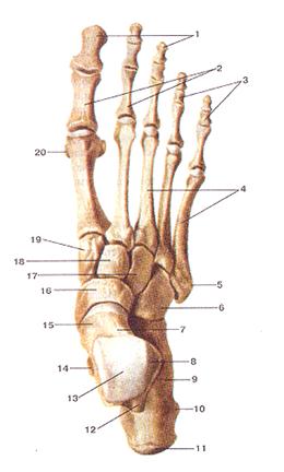 Рис. 1.50. Кости стопы. Вид сверху. 1-дистальные (ногтевые) фаланги; 2-проксимальные фаланги; 3-средние фаланги; 4-плюсневые кости; 5-буфистость V плюсневой кости; 6-кубовидная кость; 7-таранная кость; 8-латераль-ная лодыжковая поверхность; 9-пяточная кость; 10-латеральный отросток буфа пяточной кости; 11-бугор пяточной кости; 12-зад-ний отросток таранной кости; 13-блок таранной кости; 14-опора таранной кости, 15-шейка таранной кости; 16-ладьевидная кость; 17-латсральная клиновидная кость; 18-промежуточная клиновидная кость; 19-медиальная клиновидная кость; 20-сеса-мовидная кость.