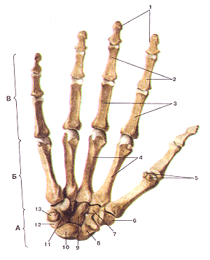 | Ладевидная, полулунная, трехгранная, гороховидная, многоугольная, трапециевидная, головчатая, крючковидная | Вего пять | 1-ый палец – 2 фаланги, со 2-го по 5-ый – 3 фаланги | |||||||