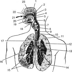 Рис. 4.1. Дыхательная система. 1 – полость рта; 2 – носовая часть глотки; 3 – мягкое нёбо; 4 – язык; 5 – ротовая часть глотки; 6 – надгортанник; 7 – гортанная часть глотки; 8 – гортань; 9 – пищевод; 10 – трахея; 11 – верхушка легкого; 12 – верхняя доля левого легкого; 13 – левый главный бронх; 14 – нижняя доля левого легкого; 15 – альвеолы; 16 – правый главный бронх; 17 – правое легкое; 18 – подъязычная кость; 19 – нижняя челюсть; 20 – преддверие рта; 21 – ротовая щель; 22 – твердое нёбо; 23 – носовая полость.