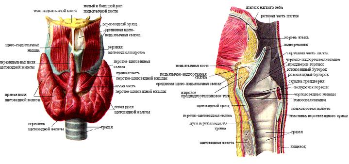 Рис. 4.3. Полость гортани на сагиттальном разрезе и щитовидная железа.