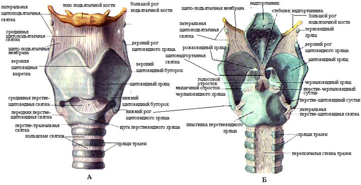 Рис. 4.4. Суставы и связки гортани. Вид спереди (А) и сзади (Б)